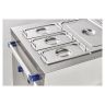 В комлпект поставки входят 2 гастроемкости GN 1/1 глубиной 150 мм и 3 гастроемкости GN 1/3 глубиной 150 мм с ручками и крышками.
