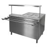 Комбинированный мармит Проммаш МЭК-1 предназначен для поддержания в горячем состоянии первых блюд в наплитной посуде и гастроемкостей со вторыми блюдами, гарнирами и соусами на предприятиях общественного питания и торговли. Модель оснащена 1 конфоркой, ванной, заполняемой водой и нагреваемой ТЭНами, расположенными под дном ванны, направляющими для подносов и полкой. Оборудование выполнено из нержавеющей стали.