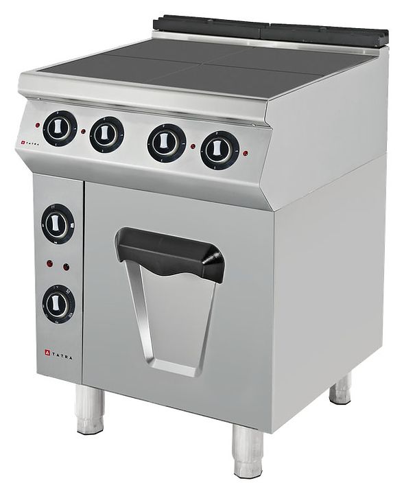 Электрическая плита Tatra TER.87O серии 700 используется на предприятиях общественного питания и торговли для приготовления различных блюд из мяса, птицы, рыбы и овощей в наплитной посуде, а также жарки и выпекания в жарочном шкафу. Модель оснащена 4 конфорками, статическим электрическим жарочным шкафом, световыми индикаторами работы нагревательных элементов и регулируемыми по высоте ножками. Подъемные конфорки со специальным креплением на петлях обеспечивают легкий доступ для обслуживания к внутренним элементам плиты. Корпус выполнен из нержавеющей стали, конфорки - из чугуна.