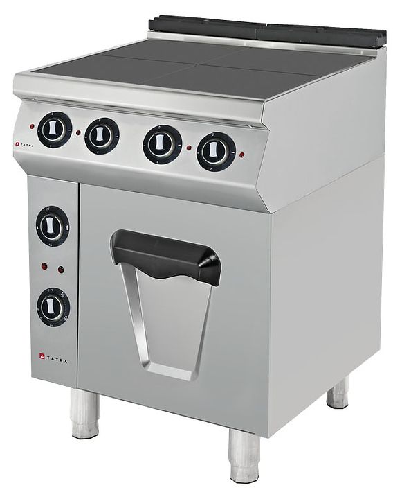 Электрическая плита Tatra TER.89O серии 900 используется на предприятиях общественного питания и торговли для приготовления различных блюд из мяса, птицы, рыбы и овощей в наплитной посуде, а также жарки и выпекания в жарочном шкафу. Модель оснащена 4 конфорками, статическим электрическим жарочным шкафом, световыми индикаторами работы нагревательных элементов и регулируемыми по высоте ножками. Подъемные конфорки со специальным креплением на петлях обеспечивают легкий доступ для обслуживания к внутренним элементам плиты. Корпус выполнен из нержавеющей стали, конфорки - из чугуна.