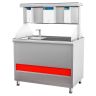 Прилавок-витрина для дезинфекции рук Abat ПВДР-70КМ используется в составе линии раздачи Аста для для санитарной обработки рук клиентов на предприятиях общественного питания и торговли. Модель оснащена лампой подсветки и полкой. Прилавок обеспечивает автоматическую бесконтактную дозацию жидкого мыла на руки клиентов, мытьё рук, сушку рук и автоматическую бесконтактную дозацию антисептического раствора на руки пользователя. Корпус выполнен из металла, кашированного под дерево.