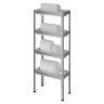 Кухонный стеллаж ATESY СКТ-Б-650-02 серии Бюджет предназначен для хранения суповых и десертных тарелок различных диаметров на предприятиях общественного питания и торговли. Модель оснащена съемными кассетами с лотками для сбора жидкости и регулируемыми по высоте опорами. Полки выполнены из нержавеющей стали AIS I430 толщиной 0,8 мм, стойки - из уголка оцинкованной стали толщиной 1,2 мм, съемные кассеты - из прутка крашеной стали толщиной 3 мм, ножки - из нержавеющей стали, основание ножек - из пластика.