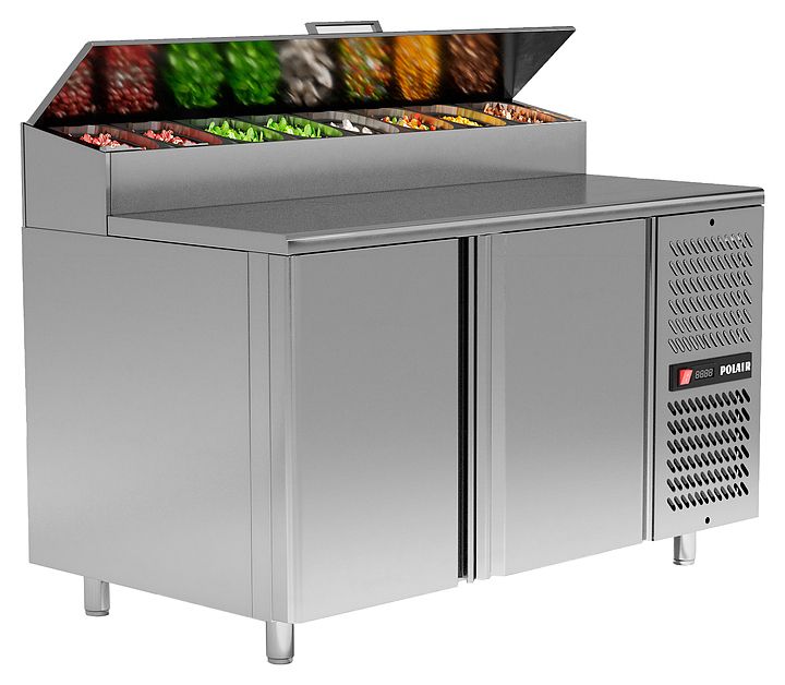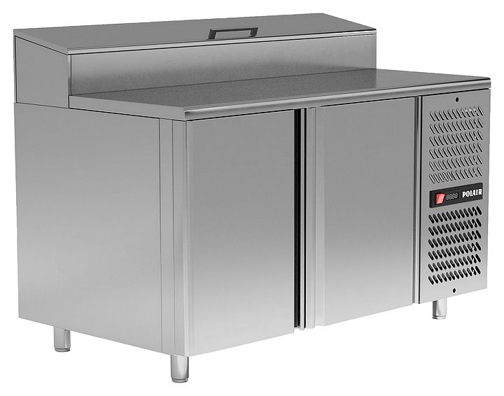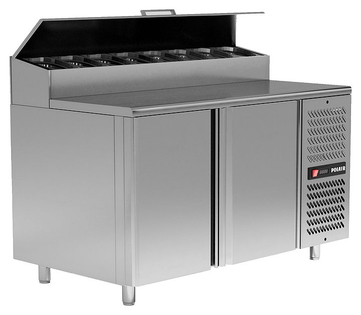 Холодильный стол POLAIR TM2GNVT-G предназначен для хранения продуктов и обработки ингредиентов в пиццерии и ресторане итальянской кухни. Модель оснащена интегрированной витриной и крышкой, которая в режиме работы фиксируется в открытом положении для удобства персонала. Обшивка корпуса и столешница выполнены из нержавеющей стали, термоизоляция корпуса и витрины - из пенополиуретана.